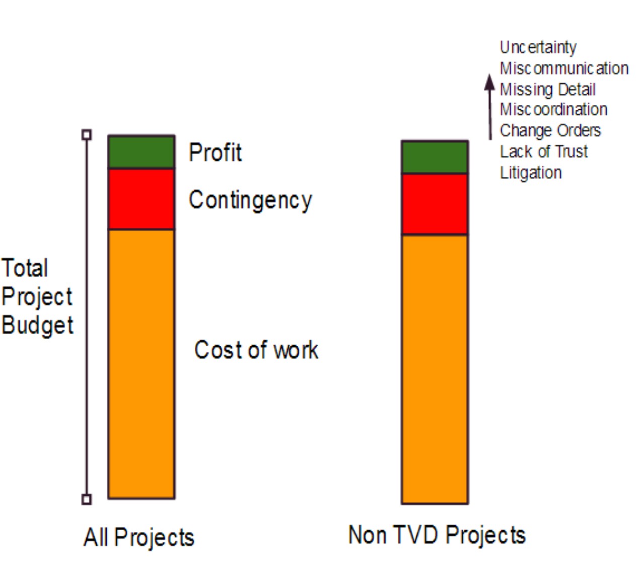 TVD інвертує цю модель. Проектувальники та підрядники об’єднують свої прибутки в загальний пул ризиків. Якщо проект завершено нижче бюджету (за умови виконання умов власника), усі ділять заощадження. Якщо проект виходить за межі бюджету, прибуток усіх скорочується. Таке негайне вирівнювання стимулів підвищує ефективність.